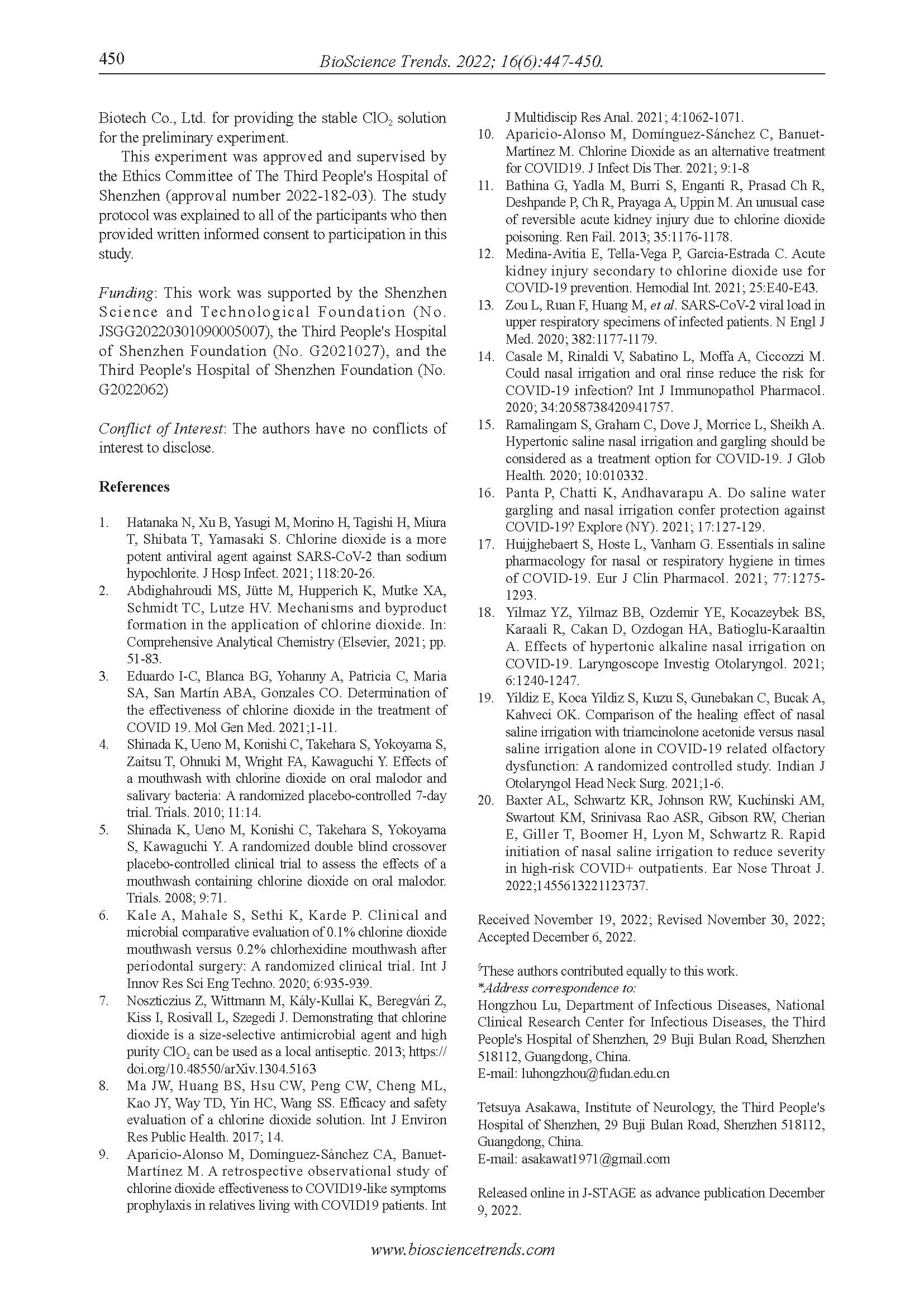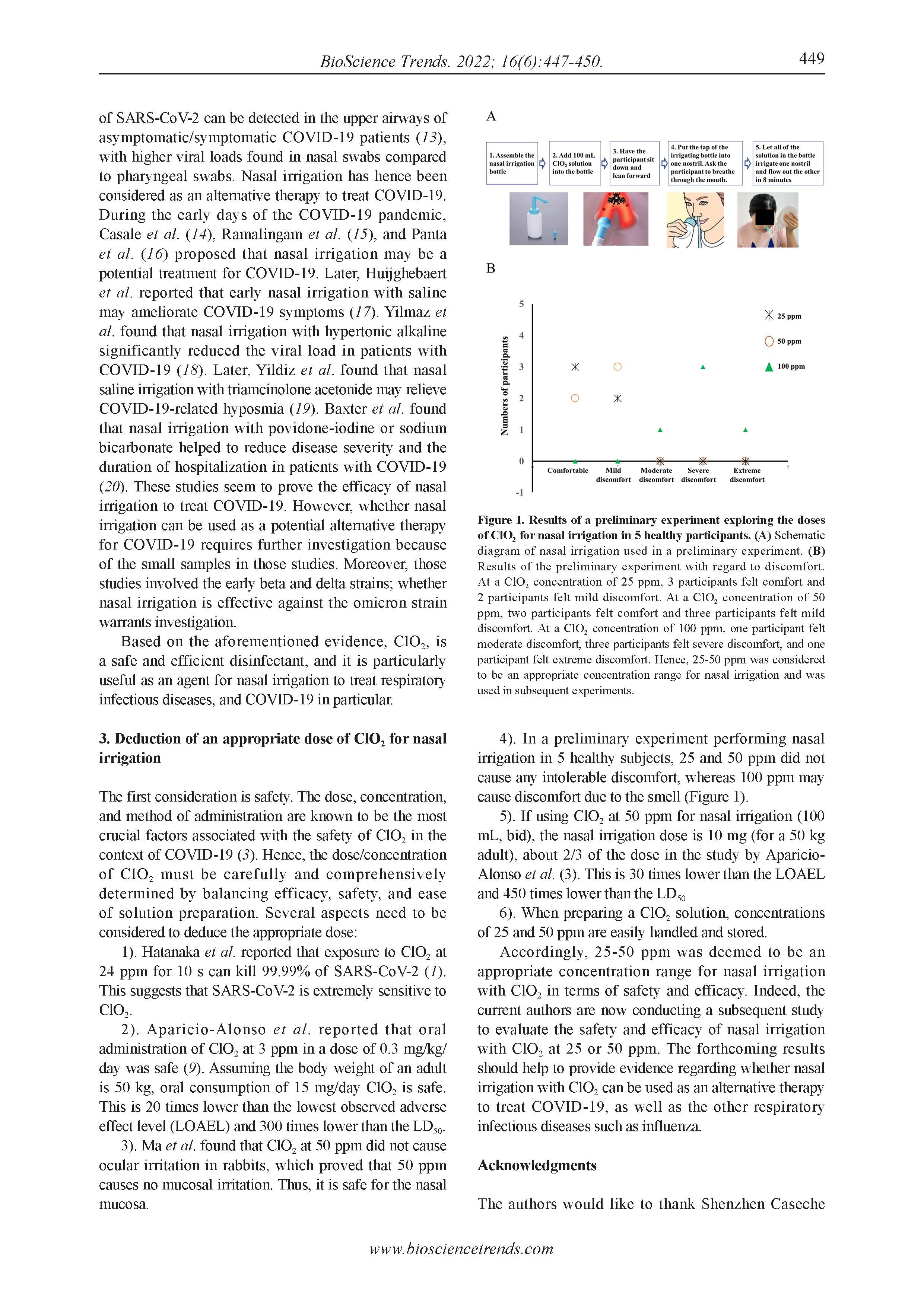 根据本通讯,运用25-50ppm的二氧化氯溶液(100ml)作为冲洗剂冲洗鼻腔不会引起不适,而100ppm会引起不适。安全性和效果本文作者们还在研究中。