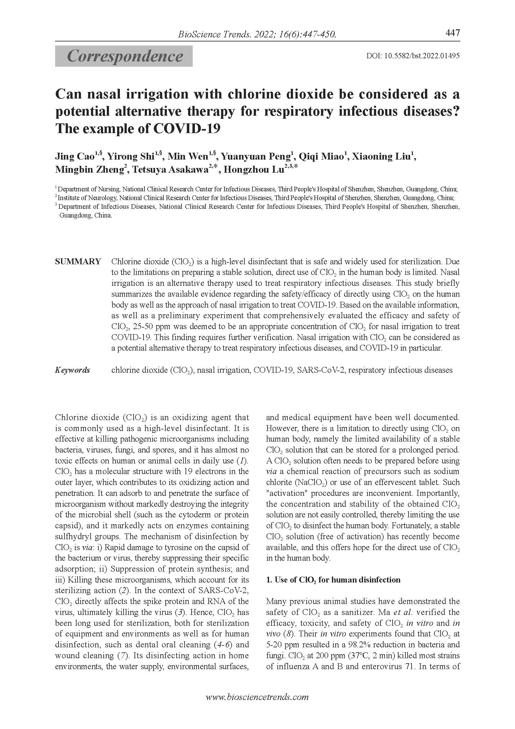 二氧化氯溶液可以冲洗鼻腔治疗呼吸道感染疾病吗?(以COVID-19为例)